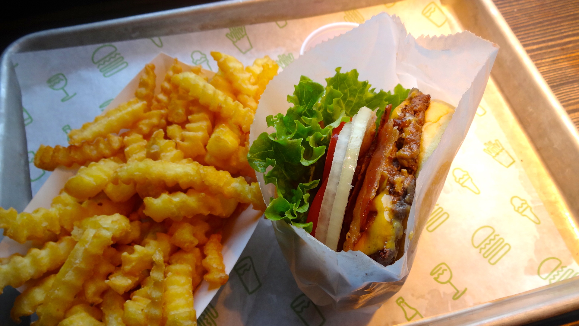 Previous Next Published April 22, 2016 at 1920 × 1080 in Boston. ShakeBurger with Onions and Applewood Smoked Bacon and Fries.