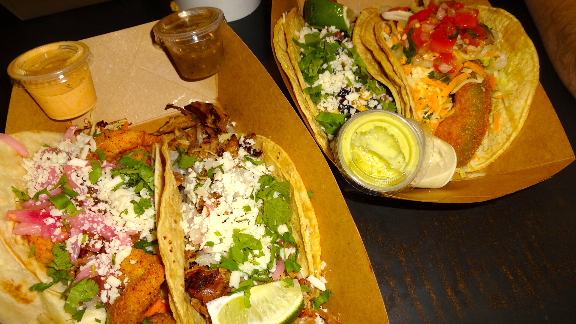 Baja Shrimp with Cabbage Slaw, Red Onion, and Queso Fresco (8.5/10), Green Chile Carnitas with Queso Fresco and Cilantro (7.5-8/10), Blackened Salmon with Grilled Corn and Black Bean Relish, and Queso Fresco (7.5-8/10), Fried Avocado with Beans, Pico de Gallo, and Cheese (7/10).