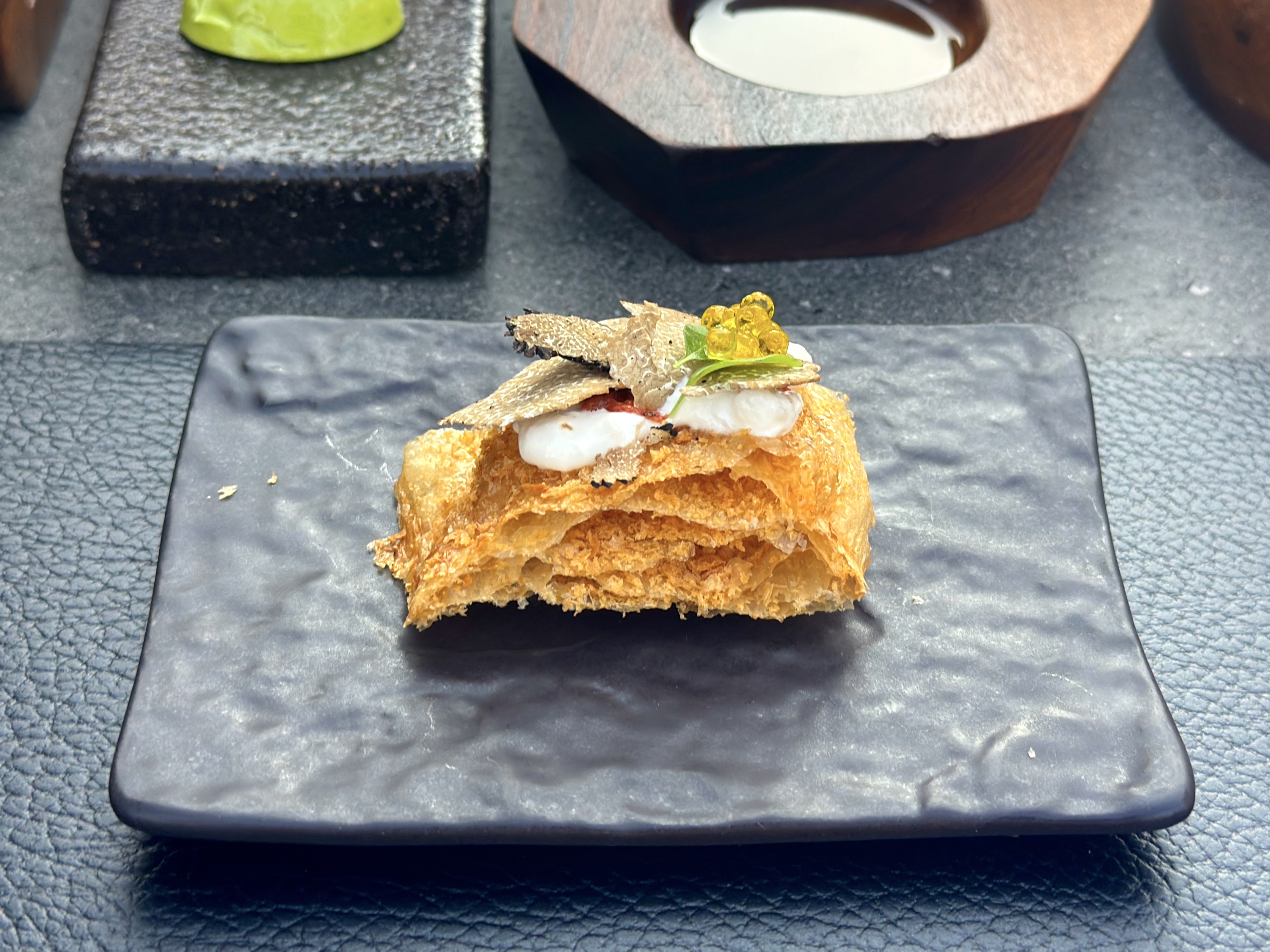 Previous Next Published September 22, 2025 at 3349 × 2511 in Review: Restaurant 360. Puff Pastry with Tomato Confit, Burrata Cheese, and Black Truffle.